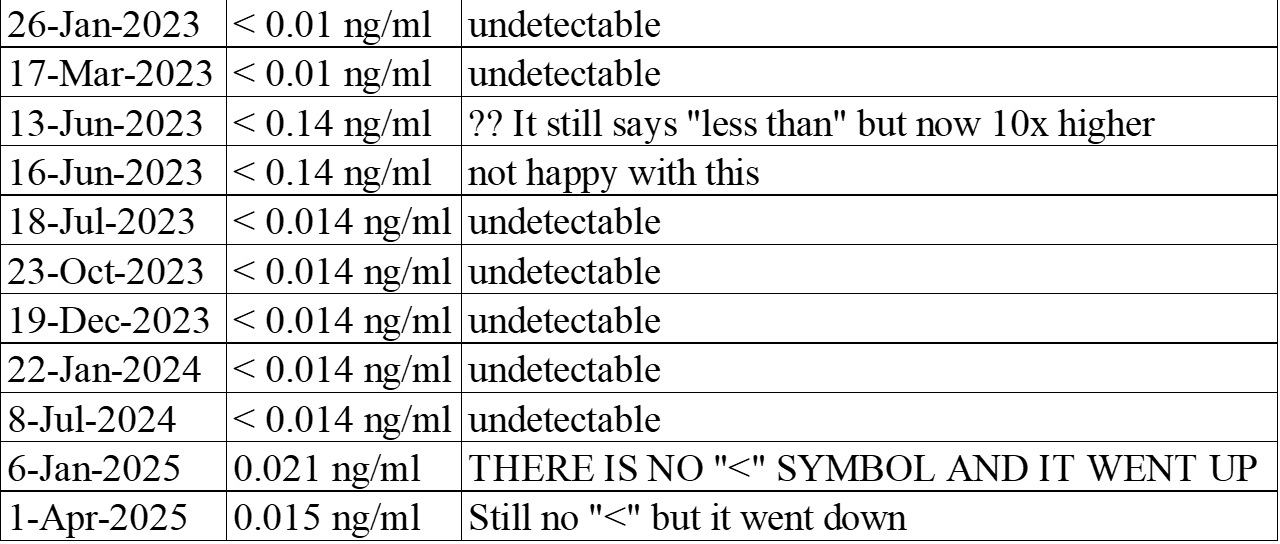 My first PSA after surgery in January 2023 was LESS THAN 0.01 nanograms, or <0.01 PPB. My PSA in January of 2025 was 0.021 PPB. Okay, that more than doubled. That’s scary, except WAIT A MINUTE GUYS, we’re talking about one percent of a part per billion. One percent of a nanogram per milliliter.